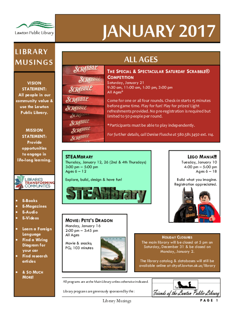 JANUARY 2017 LIBRARY MUSINGS ALL AGES THE SPECIAL & SPECTACULAR SATURDAY SCRABBLE COMPETITION Saturday, January 21 9:30 am, 11:00 am, 1:30 pm, 3:00 pm All Ages×VISION STATEMENT: All people in our