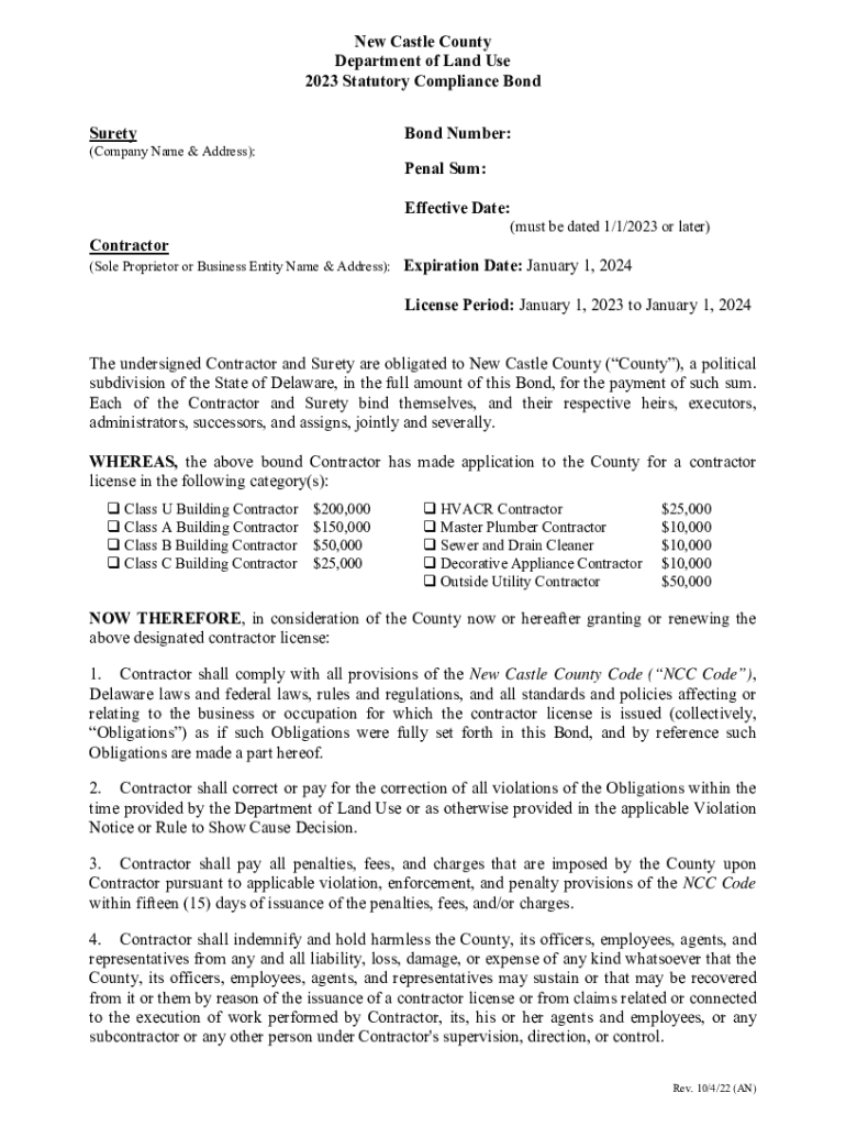New Castle County Department of Land Use 2023 Statutory Compliance Bond Surety Bond Number:(Company Name & Address):Penal Sum: Effective Date: (must be dated 1/1/2023 or later)Contractor (Sole Proprietor