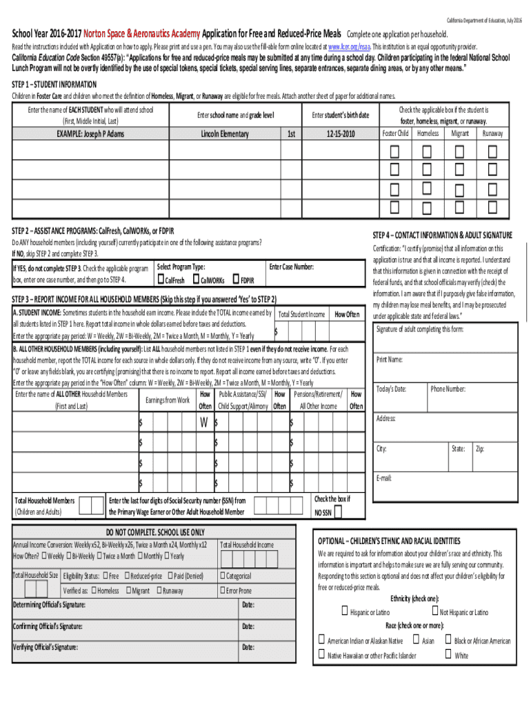 California Department of Education, July 2016School Year 20162017 Norton Space & Aeronautics Academy Application for Free and Reduced Price Meals Complete one application per household. Read the instructions