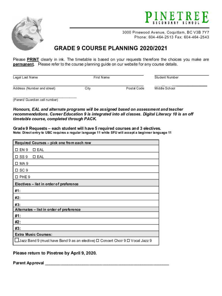 3000 Pinewood Avenue, Coquitlam, BC V3B 7Y7 Phone: 6044642513 Fax: 6044642543GRADE 9 COURSE PLANNING 2020/2021 Please PRINT clearly in ink. The timetable is based on your requests therefore the choices