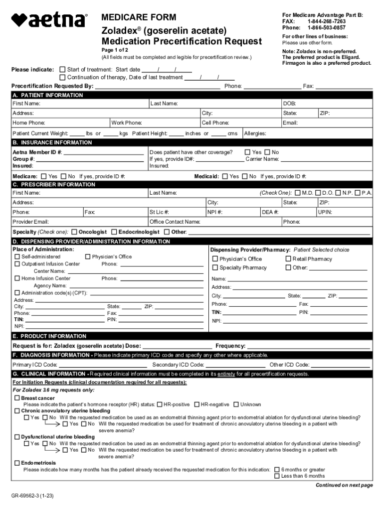 For Medicare Advantage Part B: FAX: 18442687263 Phone: 18665030857MEDICARE FORMZoladex (Rosario acetate) Medication Recertification Requestor other lines of business: Please use other form. Page 1
