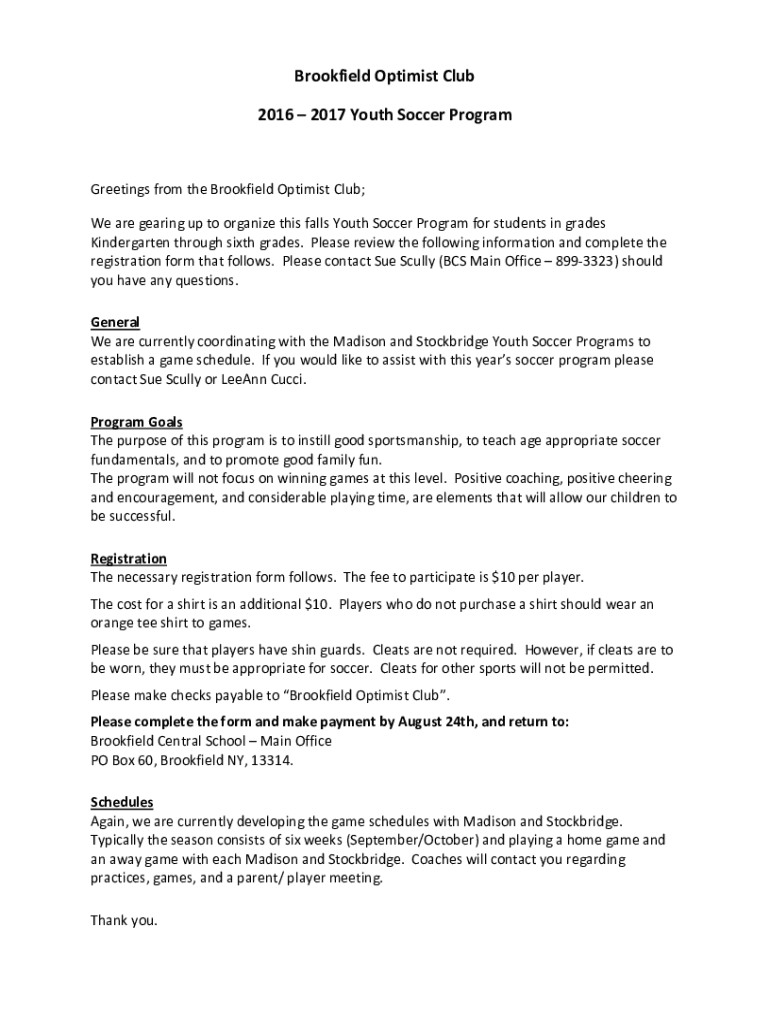 Brookfield Optimist Club 2016 2017 Youth Soccer ProgramGreetings from the Brookfield Optimist Club; We are gearing up to organize this falls Youth Soccer Program for students in grades Kindergarten