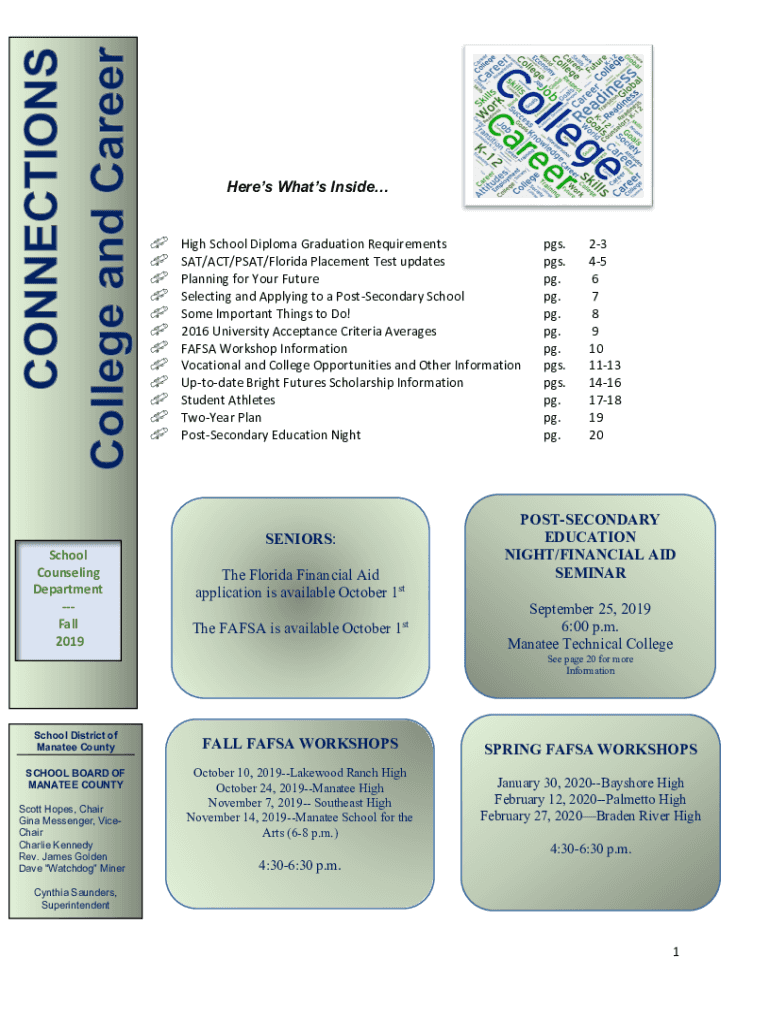 Here's What's Inside High School Diploma Graduation Requirements SAT/ACT/PSAT/Florida Placement Test updates Planning for Your Future Selecting and Applying to a PostSecondary School Some Important
