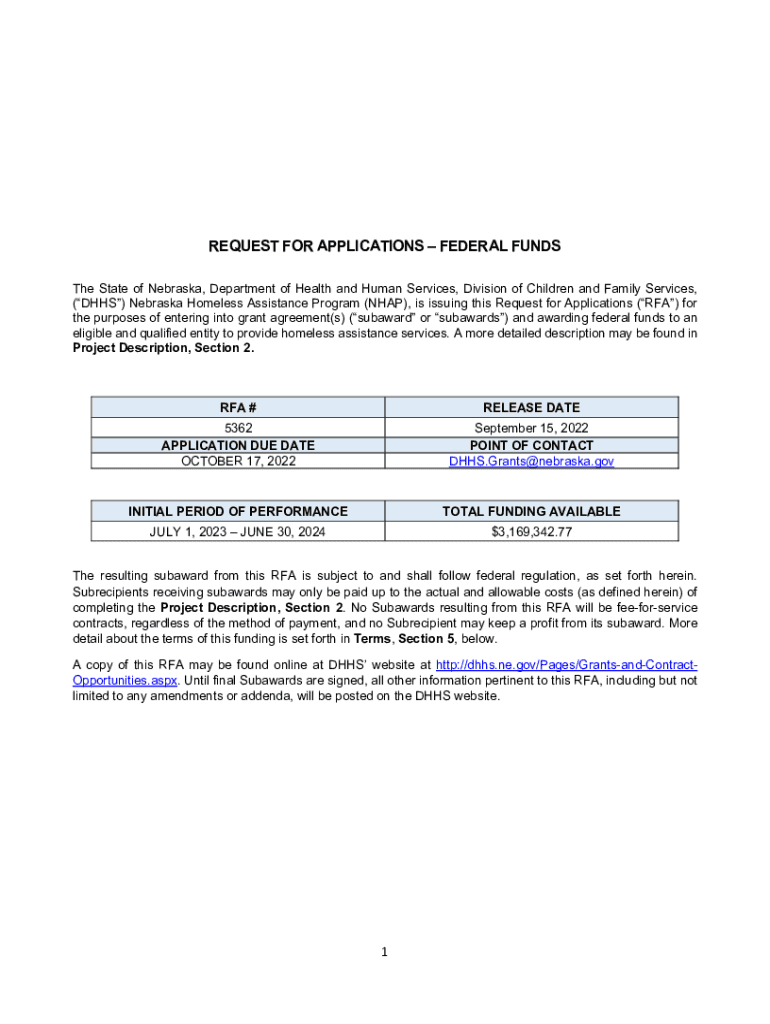 REQUEST FOR APPLICATIONS FEDERAL FUNDS The State of Nebraska, Department of Health and Human Services, Division of Children and Family Services, (HHS) Nebraska Homeless Assistance Program (CHAP),