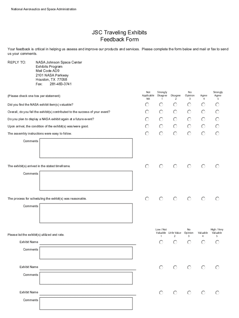 National Aeronautics and Space Administrations Traveling Exhibits Feedback Form Your feedback is critical in helping us assess and improve our products and services. Please complete the form below