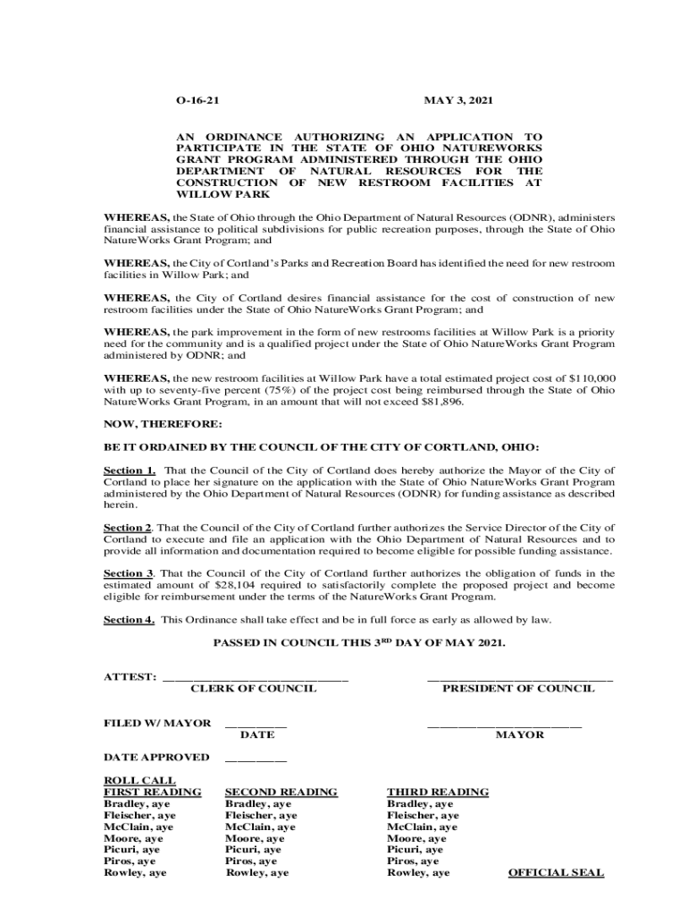 O1621MAY 3, 2021AN ORDINANCE AUTHORIZING AN APPLICATION TO PARTICIPATE IN THE STATE OF OHIO WATERWORKS GRANT PROGRAM ADMINISTERED THROUGH THE OHIO DEPARTMENT OF NATURAL RESOURCES FOR THE CONSTRUCTION