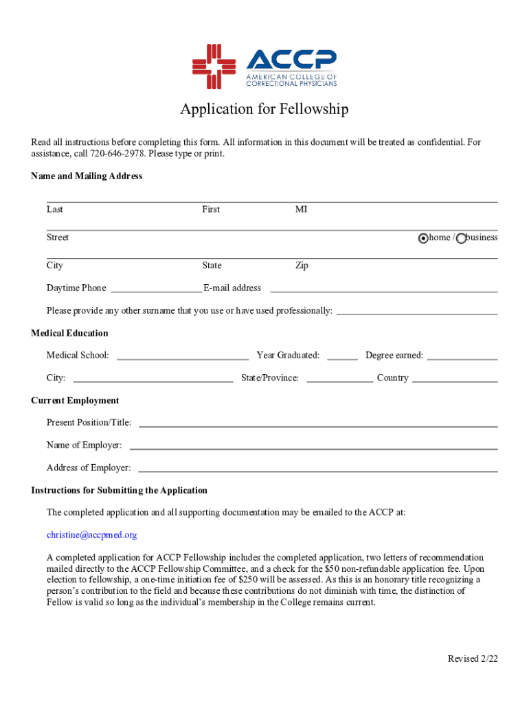 Application for Fellowship Read all instructions before completing this form. All information in this document will be treated as confidential. For assistance, call 7206462978. Please type or print.