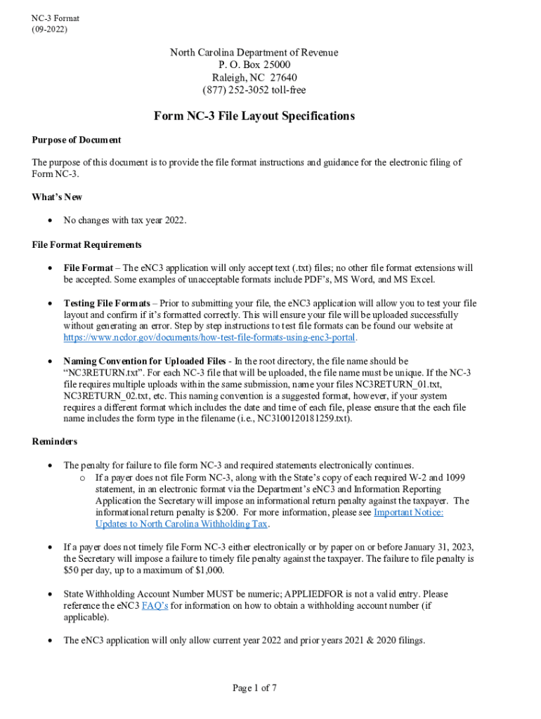 NC3 Format (092022)North Carolina Department of Revenue P. O. Box 25000 Raleigh, NC 27640 (877) 2523052 tollfreeForm NC3 File Layout Specifications Purpose of Document The purpose of this document