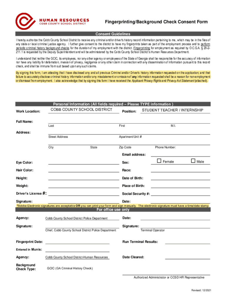 Fingerprinting/Background Check Consent Form Consent Guidelines I hereby authorize the Cobb County School District to receive any criminal and/or driver\'s history record information pertaining to