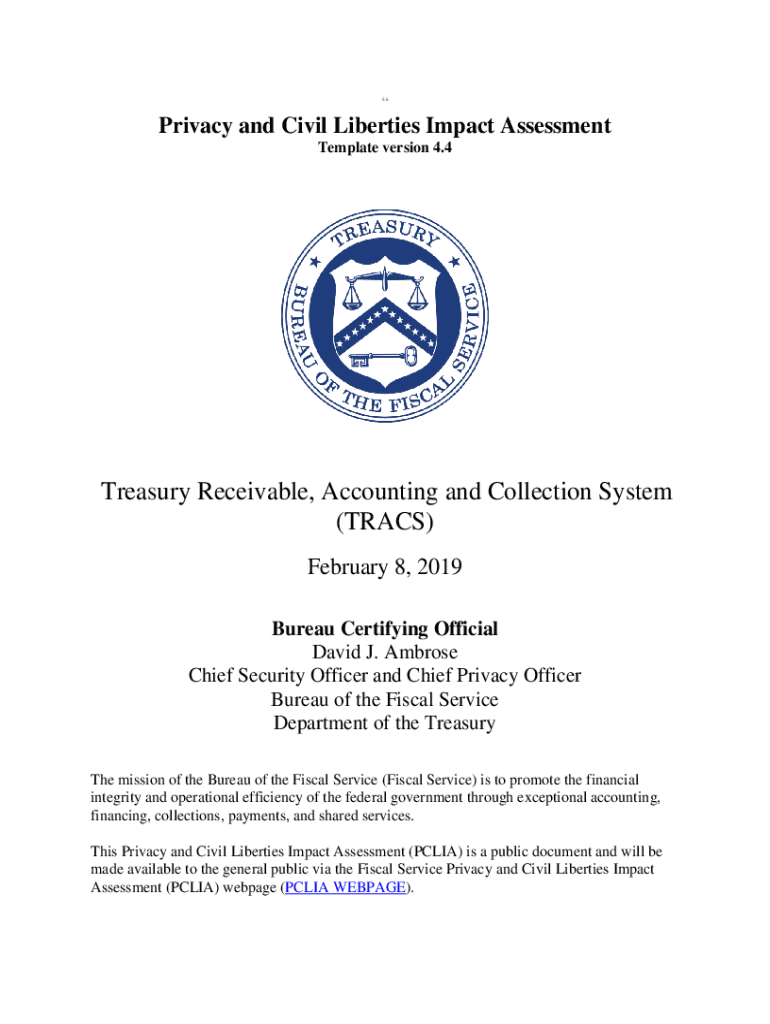 Privacy and Civil Liberties Impact Assessment Template version 4.4Treasury Receivable, Accounting and Collection System (TRACK) February 8, 2019, Bureau Certifying Official David J. Ambrose Chief