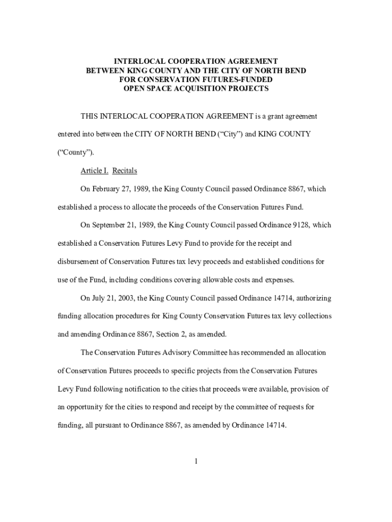 INTERLOCK COOPERATION AGREEMENT BETWEEN KING COUNTY AND THE CITY OF NORTH BEND FOR CONSERVATION FUTURESFUNDED OPEN SPACE ACQUISITION PROJECTS THIS INTERLOCK COOPERATION AGREEMENT is a grant agreement