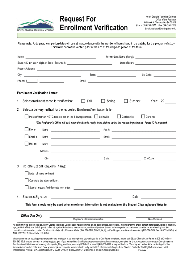Request For Enrollment Verification North Georgia Technical College Office of the Registrar PO Box 65, Clarksville, GA 30523 Phone: 7067547768 Fax: 7067547777 Email: registrar@northgatech.eduPlease