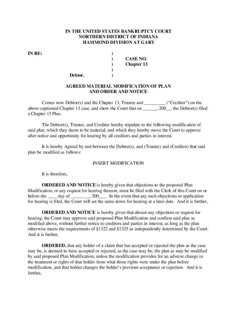 IN THE UNITED STATES BANKRUPTCY COURT NORTHERN DISTRICT OF INDIANA HAMMOND DIVISION AT GARY IN RE:Debtor.) ))))CASE NO. Chapter 13AGREED MATERIAL MODIFICATION OF PLAN AND ORDER AND NOTICE Comes now