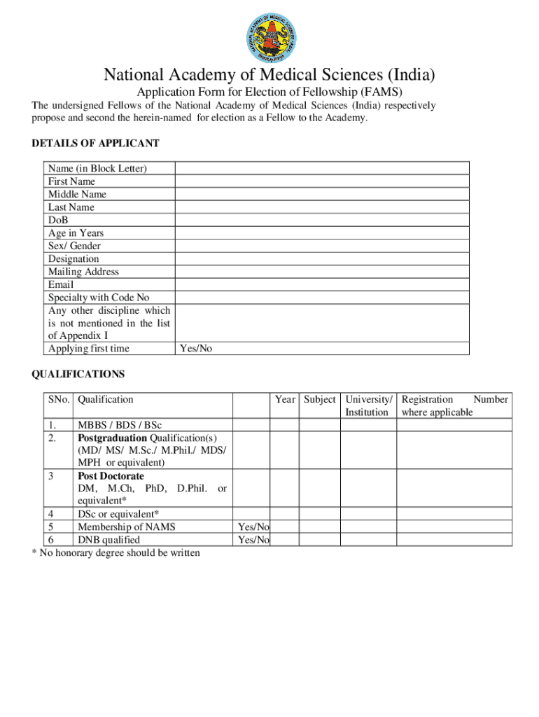 National Academy of Medical Sciences (India) Application Form for Election of Fellowship (FANS) The undersigned Fellows of the National Academy of Medical Sciences (India) respectively propose and