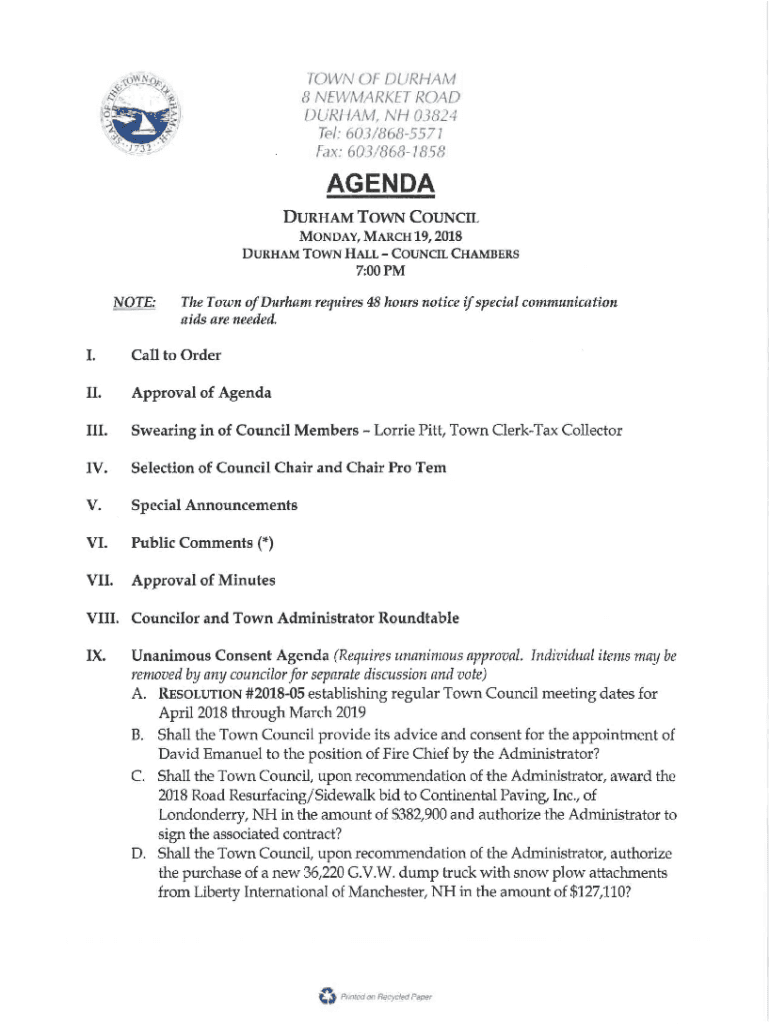 T IN OF DURHAM 8 NEWMARKET ROAD DUH M, NH 03824 Tel: 603/8685571 Fa : 603 / 868/858AGENDA DURHAM TOWN COUNCIL MONDAY, MARCH 19, 2018, DURHAM TOWN HALL COUNCIL CHAMBERS7:00PMNOTE:The Town of Durham