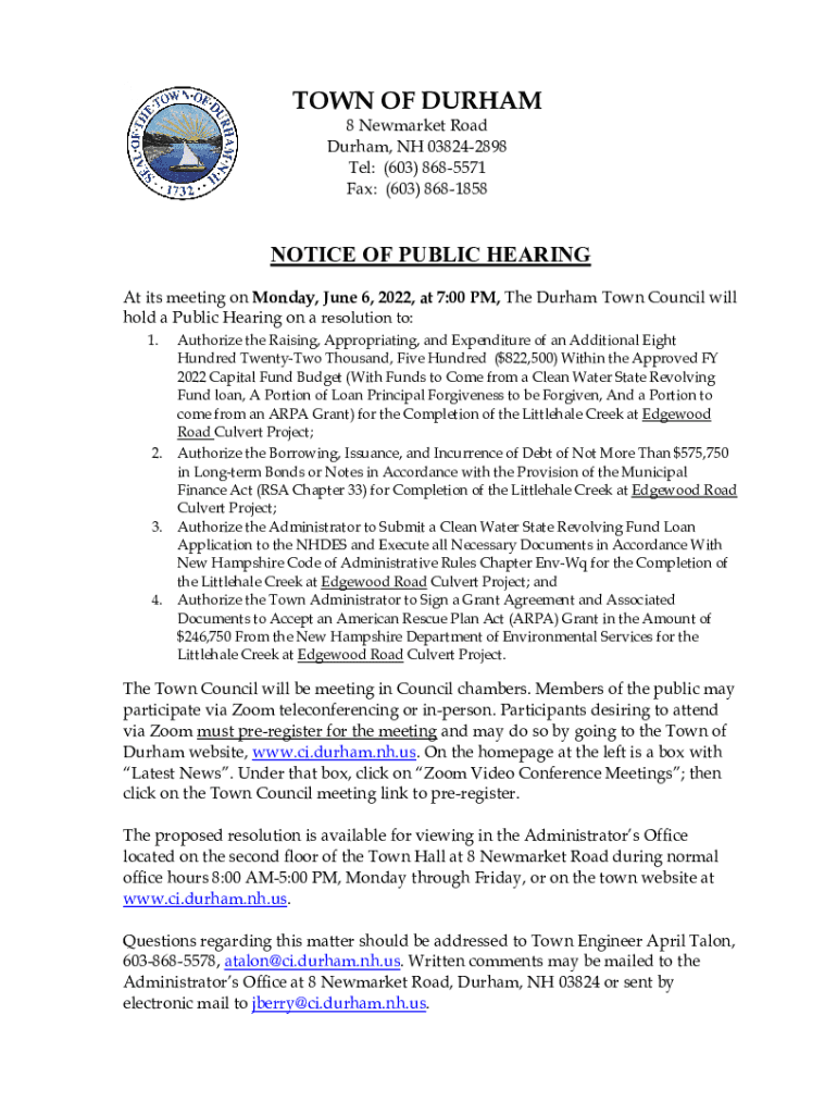 TOWN OF DURHAM 8 Newmarket Road Durham, NH 038242898 Tel: (603) 8685571 Fax: (603) 8681858NOTICE OF PUBLIC HEARING At its meeting on Monday, June 6, 2023, at 7:00 PM, The Durham Town Council will