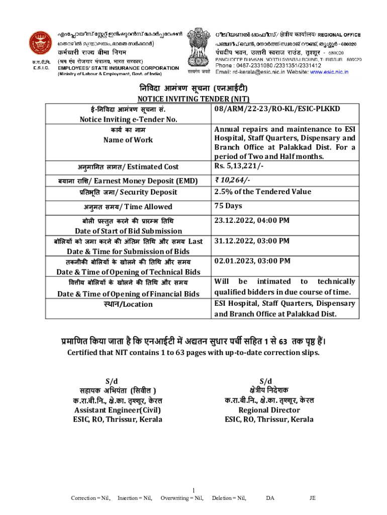 () NOTICE INVITING TENDER (NIT) 08/ARM/2223/ROLL/ESICPLKKD. Notice Inviting tender No. Annual repairs and maintenance to ESI Hospital, Staff Quarters, Dispensary and Name of Work Branch Of ice at