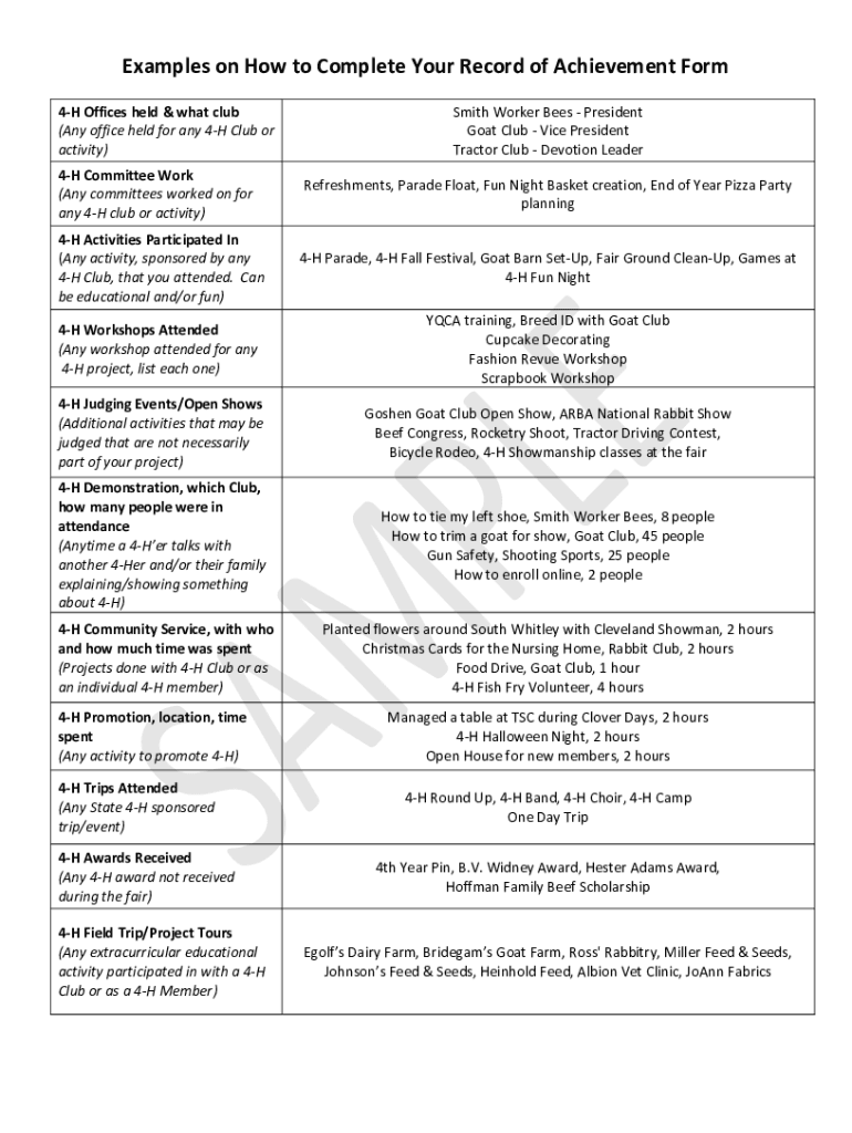 Examples on How to Complete Your Record of Achievement Form 4H Offices held & what club (Any office held for any 4H Club or activity) 4H Committee Work (Any committees worked on for any 4H club or
