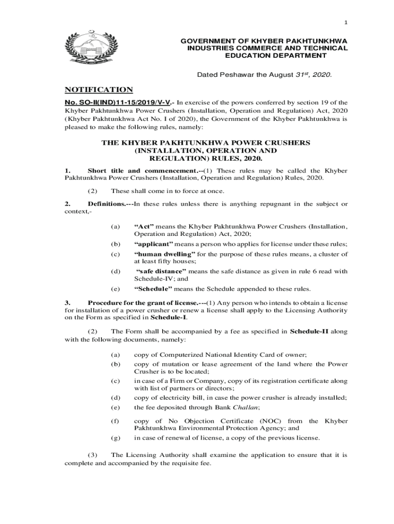 1GOVERNMENT OF KHYBER PAKHTUNKHWA INDUSTRIES COMMERCE AND TECHNICAL EDUCATION DEPARTMENT Dated Peshawar the August 31st, 2020.NOTIFICATION No. SOIL(IND)1115/2019/VS. In exercise of the powers conferred