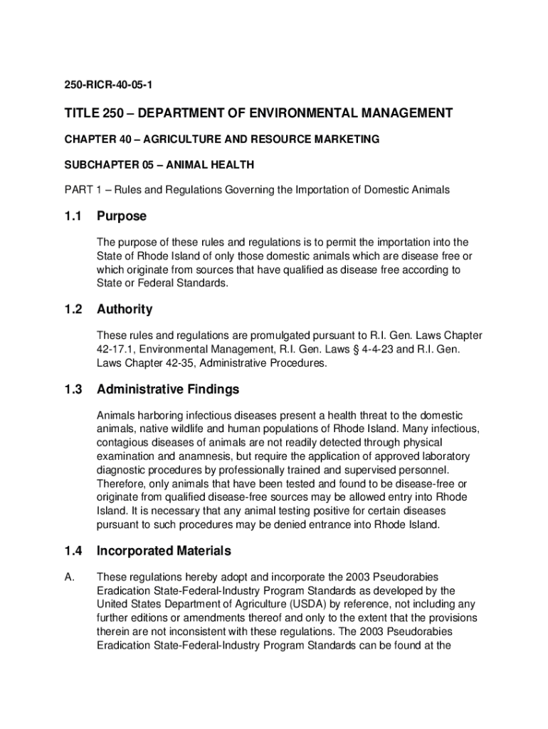 250RICR40051TITLE 250 DEPARTMENT OF ENVIRONMENTAL MANAGEMENT CHAPTER 40 AGRICULTURE AND RESOURCE MARKETING SUBCHAPTER 05 ANIMAL HEALTH PART 1 Rules and Regulations Governing the Importation of Domestic