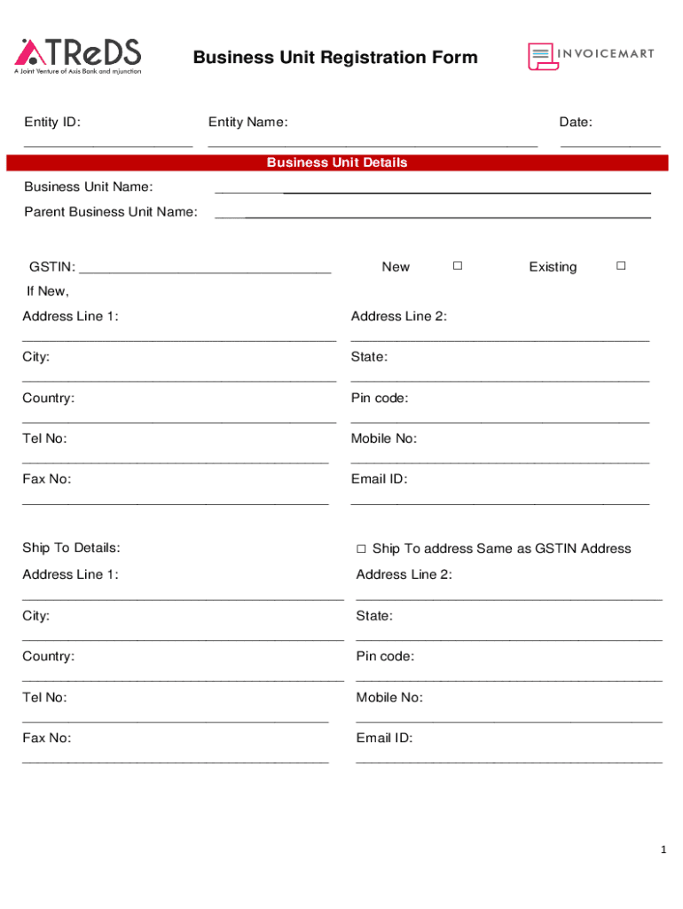Business Unit Registration Formality ID: ___Entity Name: ___Date: ___Business Unit Details Business Unit Name:___Parent Business Unit Name:___GTIN: ___NewExistingIf New, Address Line 1: ___Address