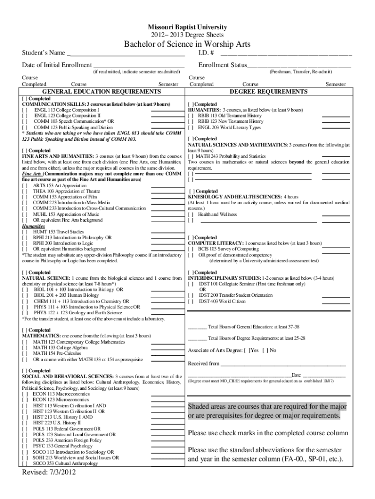 Missouri Baptist University 2012 2013 Degree SheetsBachelor of Science in Worship Arts Students Name _I. D. # ___ Enrollment Status___Date of Initial Enrollment (if readmitted, indicate semester readmitted)Course