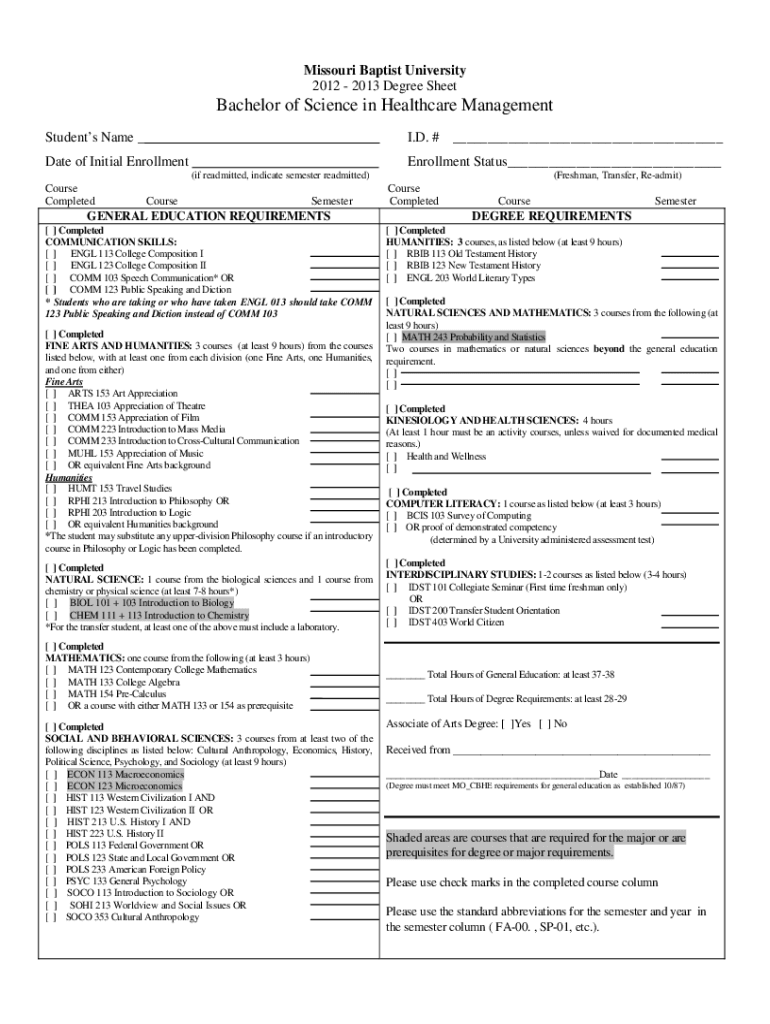 Missouri Baptist University 2012 2013 Degree SheetBachelor of Science in Healthcare Management Students Name _I. D. # ___Date of Initial EnrollmentEnrollment Status___ (if readmitted, indicate semester