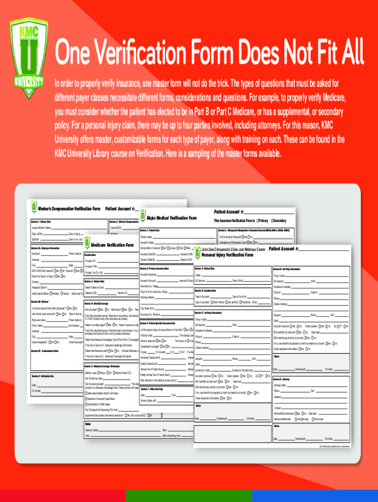 One Verification Form Does Not Fit All In order to properly verify insurance, one master form will not do the trick. The types of questions that must be asked for different payer classes necessitate