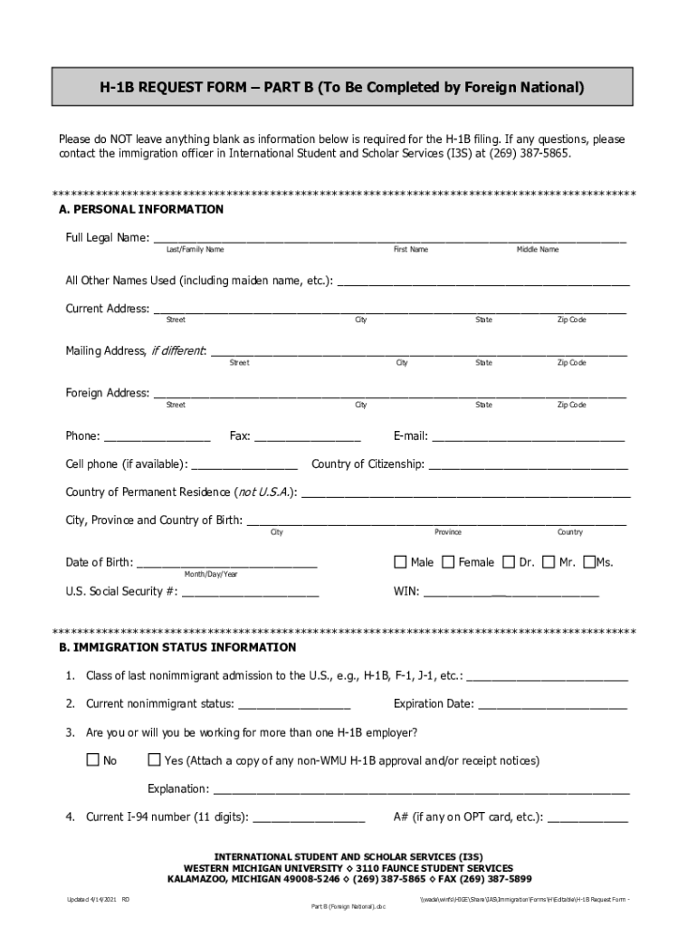 Get the free wmich.edusitesdefaultH-1B REQUEST FORM PART B (To Be Completed by Foreign National)