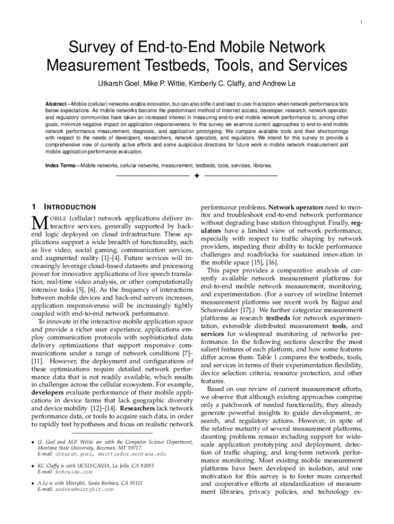 1Survey of Ended Mobile Network Measurement Test beds, Tools, and Services Stars Goal, Mike P. Wittier, Kimberly C. Cliff, and Andrew Le Abstract Mobile (cellular) networks enable innovation, but