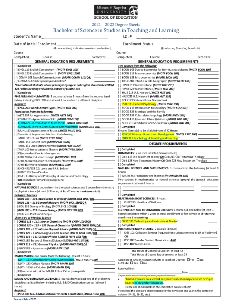 2021 2022 Degree SheetsBachelor of Science in Studies in Teaching and Learning Students Name _I. D. #Date of Initial Enrollment___Enrollment Status___(If readmitted, indicate semester readmitted)Course