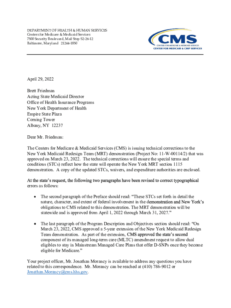 DEPARTMENT OF HEALTH & HUMAN SERVICES Centers for Medicare & Medicaid Services 7500 Security Boulevard, Mail Stop S22612 Baltimore, Maryland 212441850April 29, 2022 Brett Friedman Acting State Medicaid