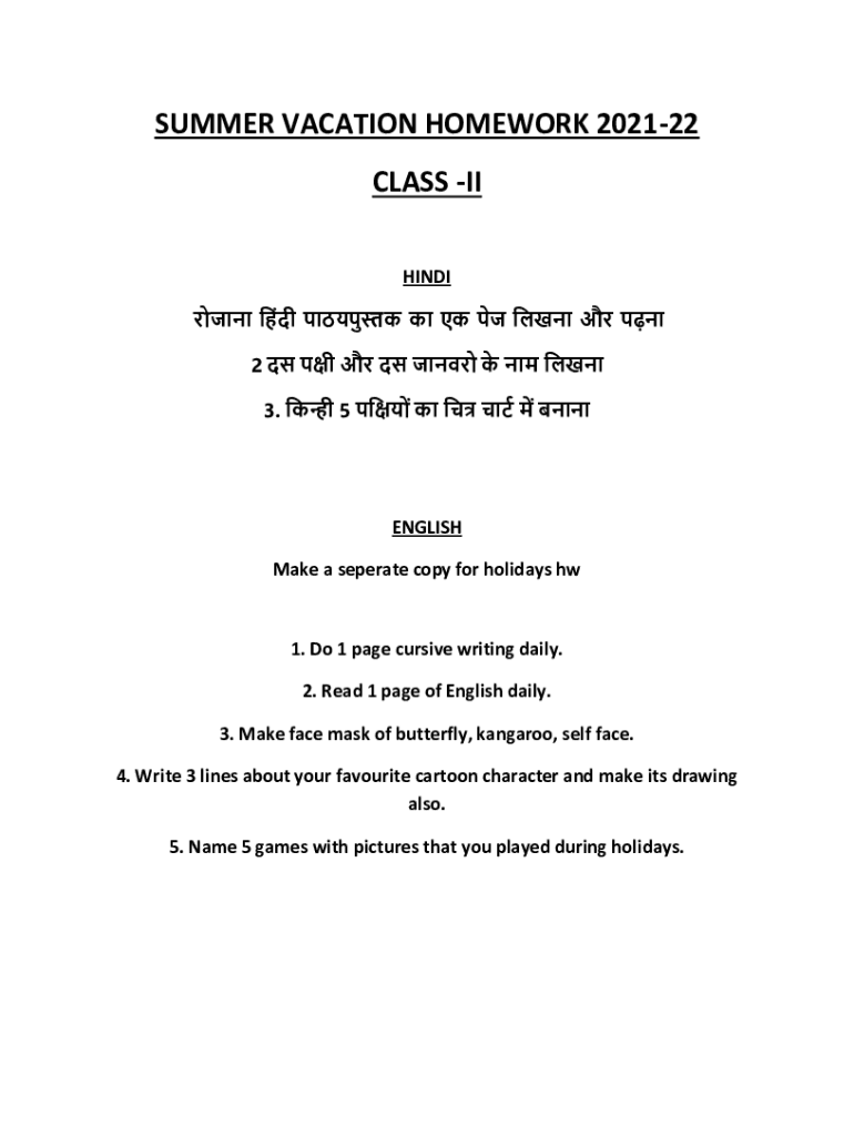 SUMMER VACATION HOMEWORK 202122 CLASS II HINDI 2 3. 5 ENGLISH Make a separate copy for holidays hw1. Do 1 page cursive writing daily. 2. Read 1 page of English daily.