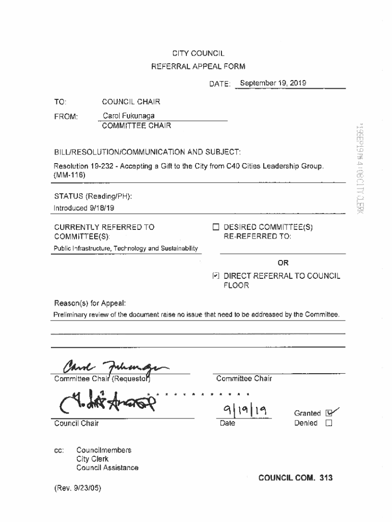 Get the free Online TO: COUNCIL CHAIR CITY COUNCIL REFERRAL APPEAL FORM ...
