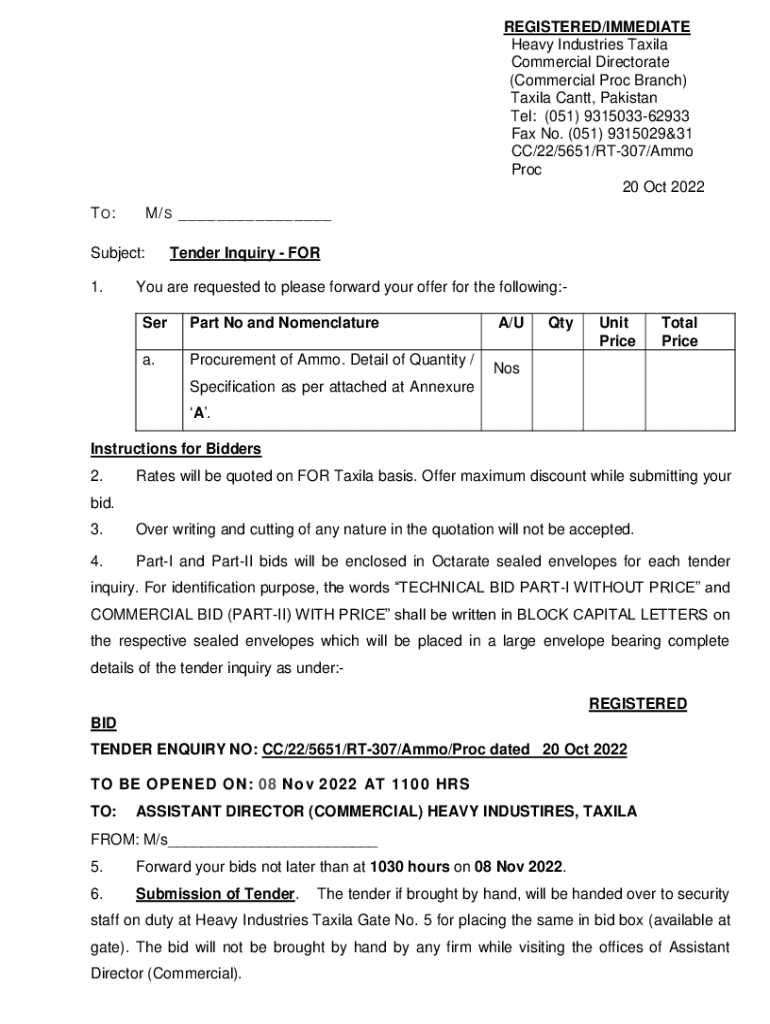 REGISTERED/IMMEDIATE Heavy Industries Taxi la Commercial Directorate (Commercial Pro Branch) Taxi la Canto, Pakistan Tel: (051) 931503362933 Fax No. (051) 9315029&31 CC/22/5651/RT307/Ammo Pro 20 Oct