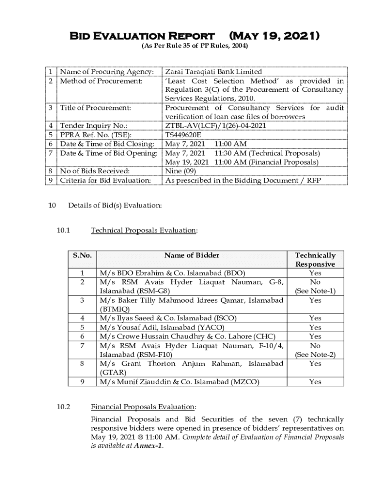 Bid Evaluation Report(May 19, 2021)(As Per Rule 35 of PP Rules, 2004)1 23 4 5 6 7 8 9 10Name of Procuring Agency: Method of Procurement:Zara Paraquat Bank Limited Least Cost Selection Method as provided