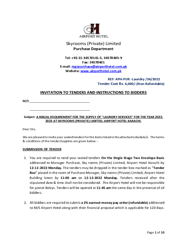 Sky rooms (Private) Limited Purchase Department Tel: +9221345701415, 345784059 Fax: 34578401 Email: mgrpurchase@airporthotel.com.pk Website: www.airporthotel.com.pk REF: APH PUR Laundry /36/2022 Tender