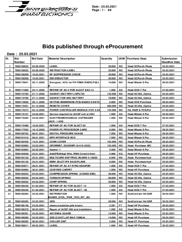 Date : 25.03.2021 Page : 1 / 84Bids published through procurement Date : 25.03.2021 SL. Bid Numbered Nanomaterial Description1700015663203.09.2020LABEL2700015663203.09.2020INSTRUCTION LABEL3700015820916.03.20214700015820916.03.20215700017064130.11.2020UOM