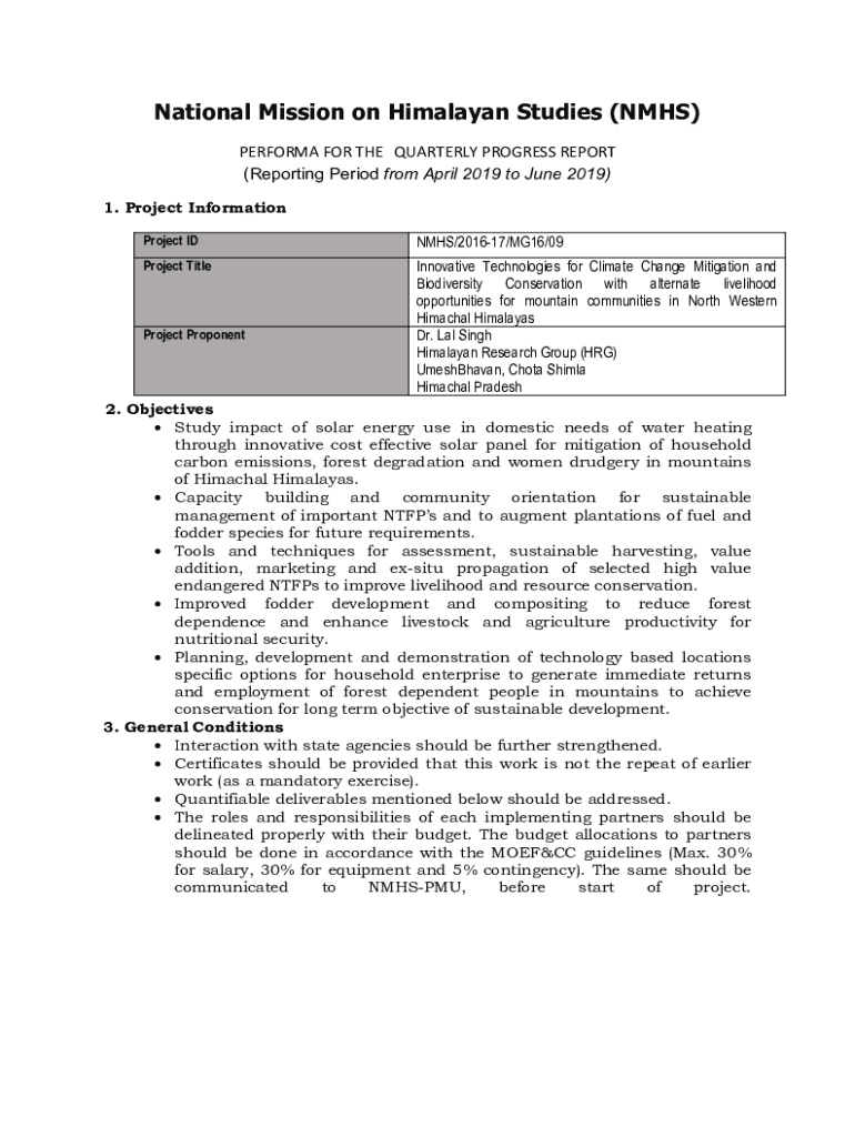 National Mission on Himalayan Studies (NHS) PERFORM FOR THE QUARTERLY PROGRESS REPORT (Reporting Period from April 2019 to June 2019) 1. Project Information Project IDMS/201617/MG16/09Project TitleInnovative