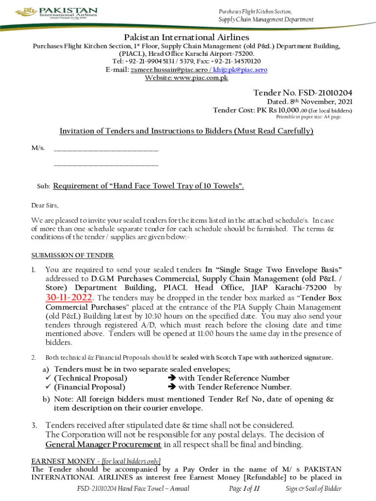 Purchases Flight Kitchen Section, Supply Chain Management Department Pakistan International Airlines Purchases Flight Kitchen Section, 1st Floor, Supply Chain Management (old P&L) Department Building,