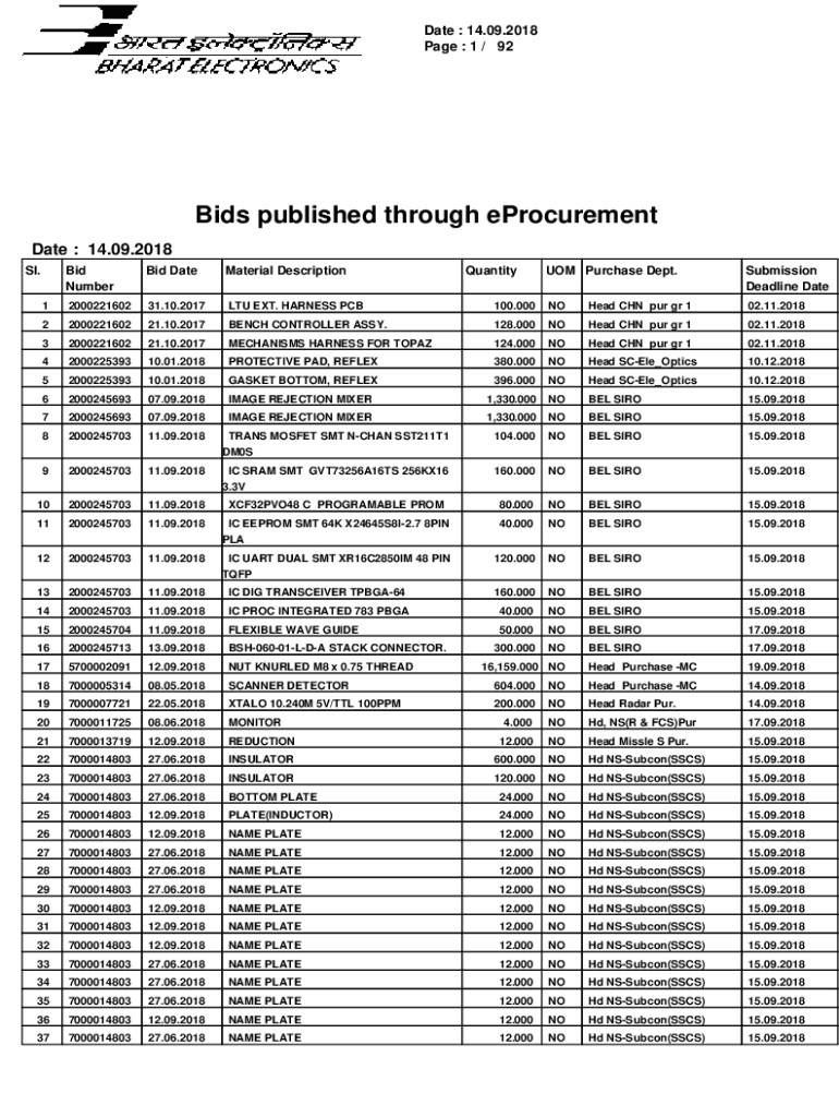 Date : 14.09.2018 Page : 1 / 92Bids published through procurement Date : 14.09.2018 SL. Bid Numbered Nanomaterial Description1200022160231.10.2017LTU EXT. HARNESS PCB2200022160221.10.2017BENCH CONTROLLER