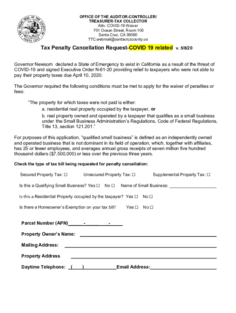 OFFICE OF THE AUDITORCONTROLLER/ TREASURER COLLECTOR Attn: COVID-19 Waiver 701 Ocean Street, Room 100 Santa Cruz, CA 95060 TTC.webmail@santacruzcounty.usTax Penalty Cancellation Request COVID-19 related.