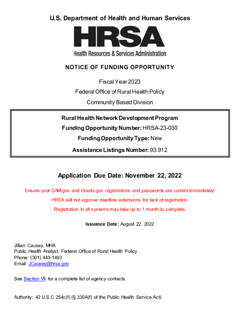 U.S. Department of Health and Human ServicesNOTICE OF FUNDING OPPORTUNITY Fiscal Year 2023 Federal Office of Rural Health Policy Community Based Division Rural Health Network Development Program Funding