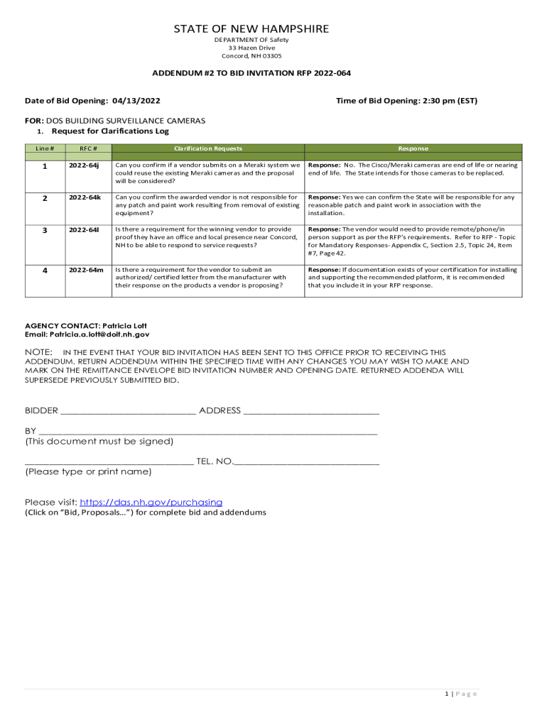 STATE OF NEW HAMPSHIRE DEPARTMENT OF Safety 33 Haven Drive Concord, NH 03305ADDENDUM #2 TO BID INVITATION RFP 2022064 Date of Bid Opening: 04/13/2022Time of Bid Opening: 2:30 pm (EST)FOR: DOS BUILDING