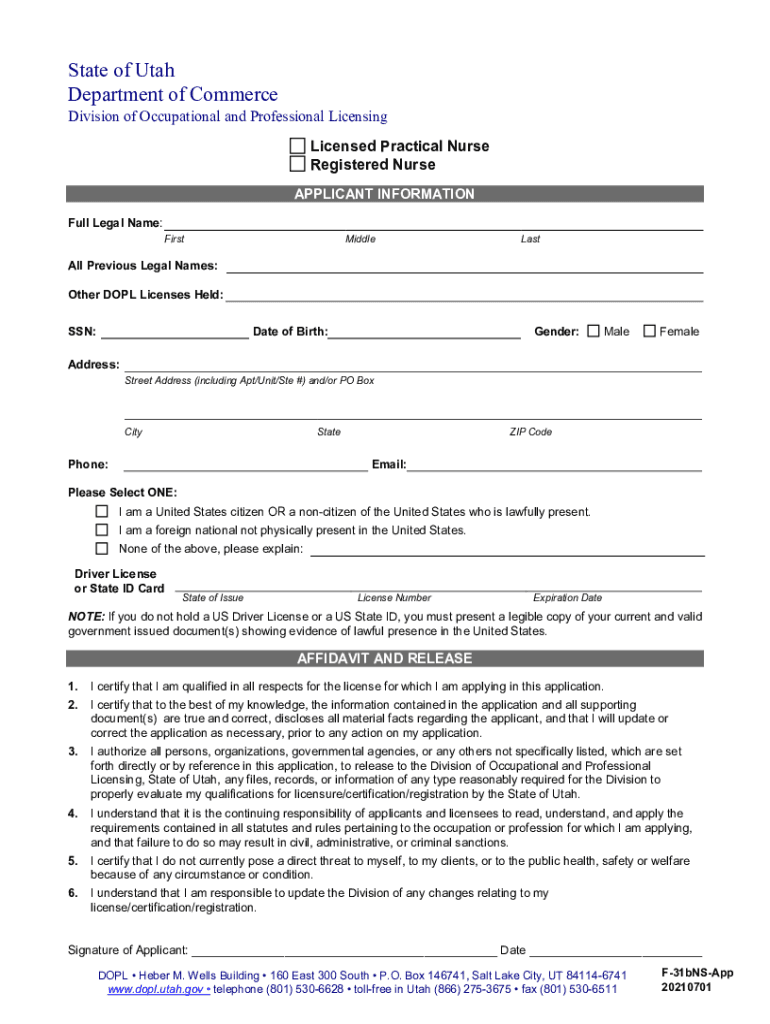 State of Utah Department of CommerceDivision of Occupational and Professional Licensing Licensed Practical Nurse Registered Nurse APPLICANT INFORMATION Full Legal Name: FirstMiddleLastAll Previous