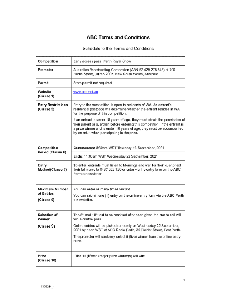 ABC Terms and Conditions Schedule to the Terms and Conditions CompetitionEarly access pass: Perth Royal ShowPromoterAustralian Broadcasting Corporation (ABN 52 429 278 345) of 700 Harris Street, Ultimo