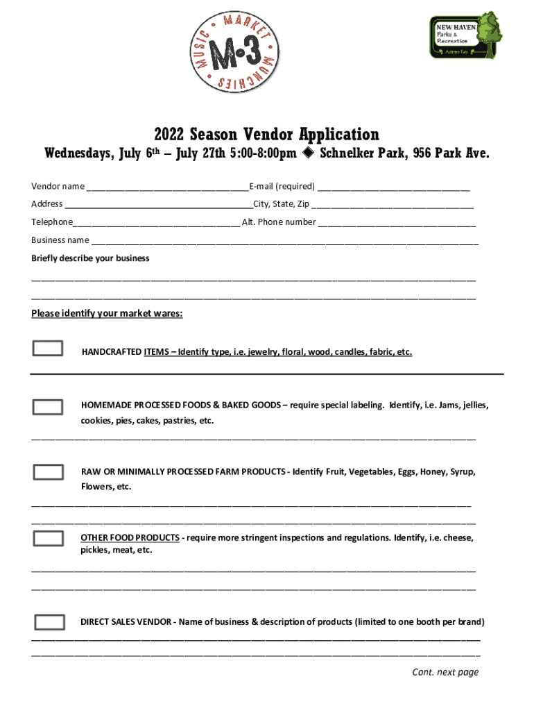 2022 Season Vendor Application Wednesdays, July 6th July 27th 5:008:00pm Schneider Park, 956 Park Ave. Vendor name ___Email (required) ___ Addressing, State, Zip ___Telephone___ Alt. Phone number