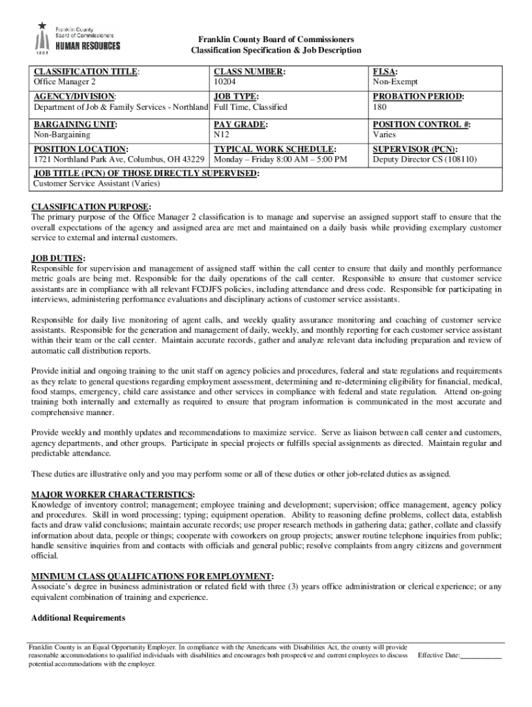 Franklin County Board of Commissioners Classification Specification & Job Description CLASSIFICATION TITLE: Office Manager 2CLASS NUMBER: 10204FLSA: NonExemptAGENCY/DIVISION: JOB TYPE: Department