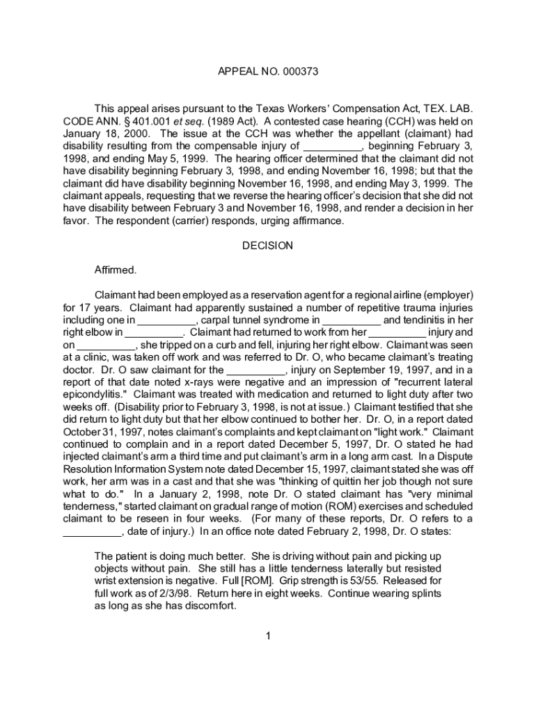APPEAL NO. 000373 This appeal arises pursuant to the Texas Workers Compensation Act, TEX. LAB. CODE ANN. 401.001 et seq. (1989 Act). A contested case hearing (CCH) was held on January 18, 2000. The