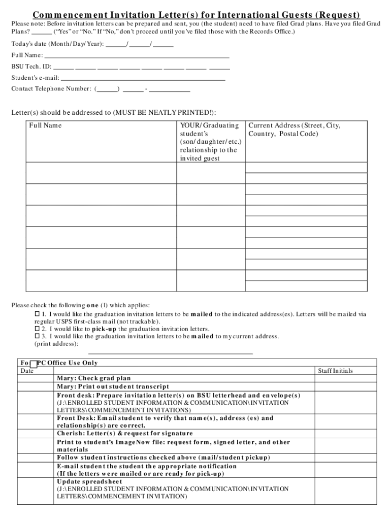 Commencement Invitation Letter(s) for International Guests (Request)Please note: Before invitation letters can be prepared and sent, you (the student) need to have filed Grad plans. Have you filed